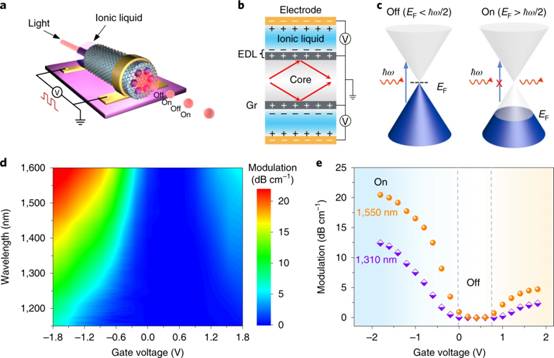 基于这种特殊复合结构,Gr-PCF实现了强烈的光与物质相互作用,光衰减系数高达8 dB cm-1,远高于单层石墨烯的光衰减效率。通过对光纤内部的石墨烯进行离子液体栅压调控,能够实现可调节的光与石墨烯相互作用。基于Gr-PCF制备的电光调制器具有宽频带光响应(1150-1600 nm光通讯波段)特性,在低电压(< 2 V)下实现了1550 nm光信号高达20 dB cm-1的深度调制(图2)。这为全光纤系统的光信号传输、调制和检测一体化提供了可能。
