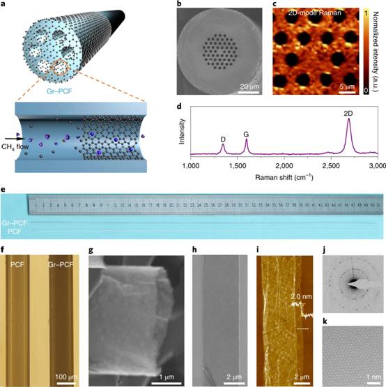 本工作首次提出利用化学气相沉积法制备长度可达半米的石墨烯光子晶体光纤材料(Gr-PCF)。该方法的特点在于能够在PCF的内部微细孔道中实现不同厚度、均匀性的石墨烯薄膜的直接原位生长。按照传统的石墨烯生长理论,如果没有金属催化剂的参与,在长距离PCF微米级孔洞中直接生长石墨烯是非常困难的。为保持光纤结构和功能不变性,该石墨烯生长过程未引入金属催化剂。而是根据气体的流体力学理论,利用反应气体的分子流模型设计实验条件,突破了限阈空间中石墨烯的无催化生长瓶颈,成功实现了孔道内壁高质量石墨烯薄膜的均匀生长(图1)。